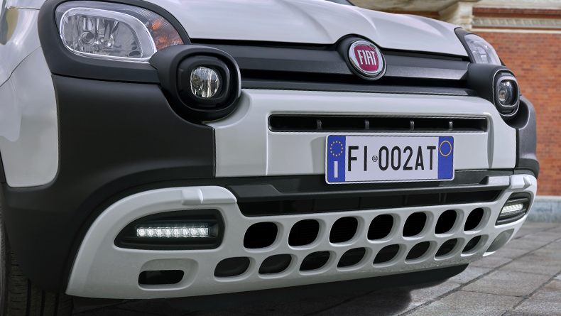 'The new Fiat Pandina Cross has a unique look, recognizable form afar with its white or black painted front/rear skidplates and side moulding with the Pandina logo. In addition, its comes with black roof rails and yellow or body color mirror caps.
