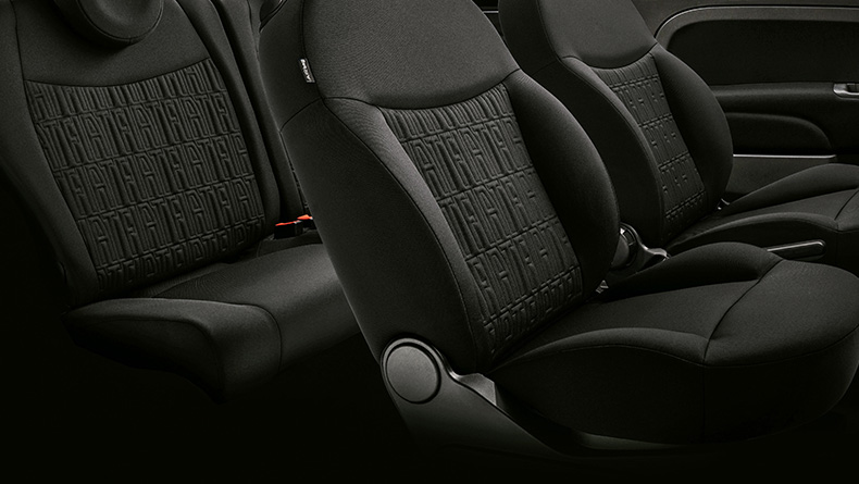 Sit comfortably on the black recycled-fabric seats with the Fiat monogram. Sustainable down to the smallest detail.